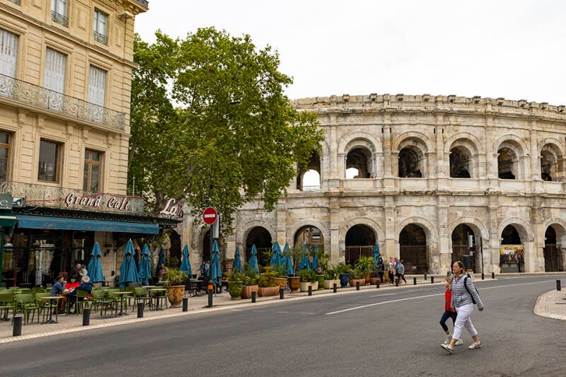 Met een glas wijn zitten we een dag later weer tussen de geurige en kleurige bloemen op het camperveld en bij het bekijken van de foto's overdenken we onze prachtige dag in Nîmes. De verplichte bezoeken aan de enorme Romeinse arena waar het spektakelstuk over Vercingetorix wordt geoefend, de antieke tempels en de Romeinse overblijfselen uit de eerste eeuwen na Christus, fietsen we door de stad en stappen af waar we iets leuks zien.