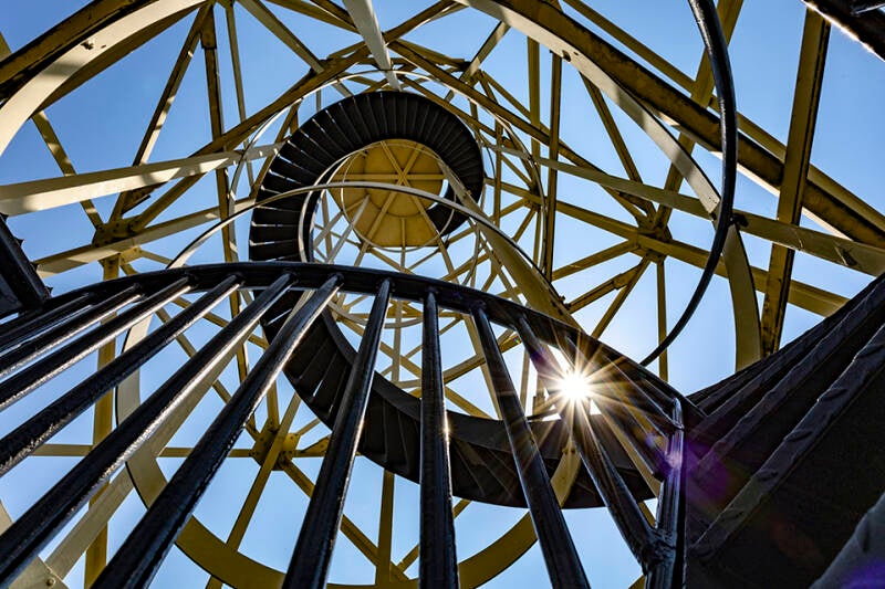 We picknicken onder de vuurtoren in Lemmer en ik struikel over de grote blokken terwijl ik van onder naar boven het lijnenspel in de vuurtoren fotografeer. Elke stand biedt een ander schouwspel en terwijl de metalen constructie van het bouwwerk met de zon speelt breek ik nog net mijn enkels niet. Ik denk dat ik nog nooit zo lang in een vuurtoren naar boven heb gekeken, meestal is het andersom....