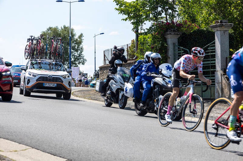 Na een tijdje komen de eerste auto's en motoren de bocht om en na een halfuurtje komt er een auto met de tekst "la caravane arrive - 5 minutes"! De camera en telefoon liggen klaar om te fotograferen en wat te filmen. Mijn telefoon geeft aan dat het apparaat eerst moet afkoelen, want het is te warm! Gelukkig duurt die karavaan wel even en filmen lukt dan ook, even later.