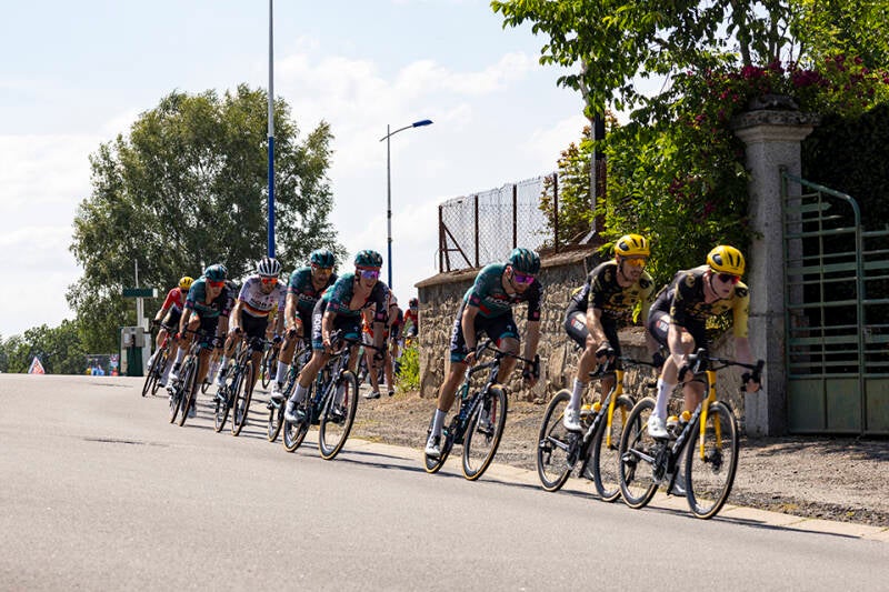 Ons geduld wordt beloond! Een kopgroep komt voorbij met alle belangrijke hotemetoten die bij hen horen. Voordat je het weet zijn ze voorbijgeflitst, richting Puy de Dôme, de vulkaan van 1465 meter hoog, waar de finish is.