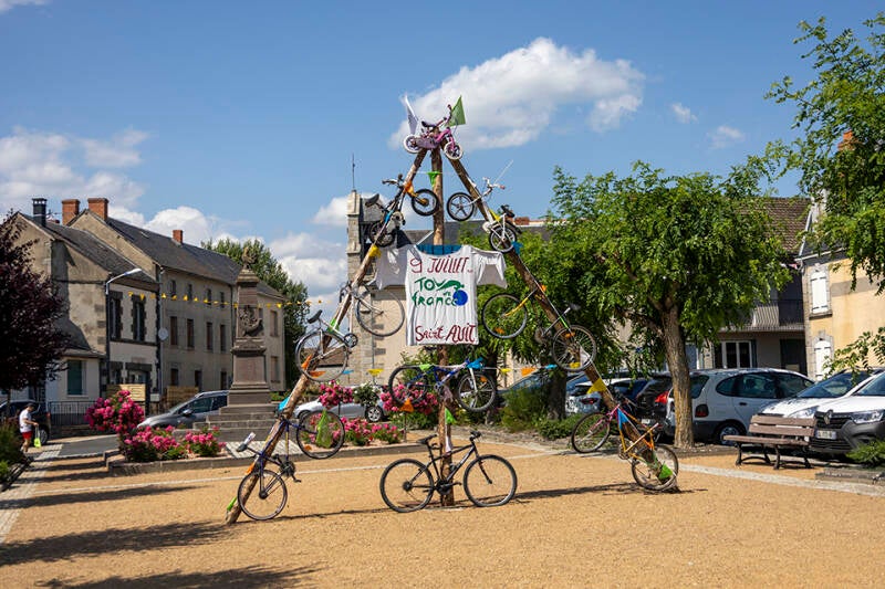We zijn op de fiets naar Saint Avit gegaan en hebben onze krukjes aan de kant van de weg gezet in het dorpje. We gaan de Tour de France meemaken! Het is er nog redelijk rustig, de sfeer is goed en het zonnetje schijnt. De thermometer tikt net de dertig graden niet aan.