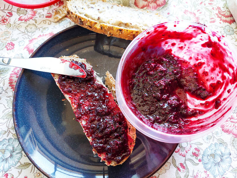 Ik haal het laatste pak geleisuiker uit de Intermarché, genoeg voor ons emmertje bramen en na vijf minuten heb ik bramenjam voor de komende maand! Het smaakt ook nog eens heerlijk!!
