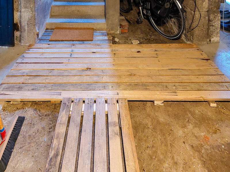 Van de pallets waarop de geleverde kozijnen en deuren zijn afgeleverd, maakt Jappie een handig plankier in de kelder, zodat we niet meer over de stoffige jutezakken hoeven te stappen, die over de onbewerkte grond liggen. Het vocht kan er gewoon uit en wij houden schone voeten! Waar die pallets al niet goed voor zijn! Een kokosmatje bij de trap en er kan weer een klusje worden afgevinkt!