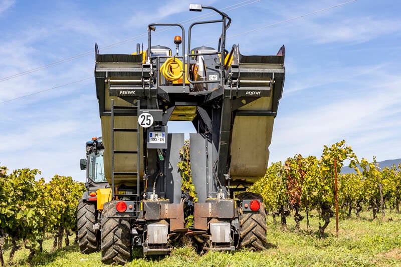 De druivenoogst is begonnen. Indrukwekkende druivenplukmachines schuiven rustig over de - in rechte lijnen geplante - druivenstokken, die volhangen met bewonderenswaardige trossen paarsgekleurde druiven.