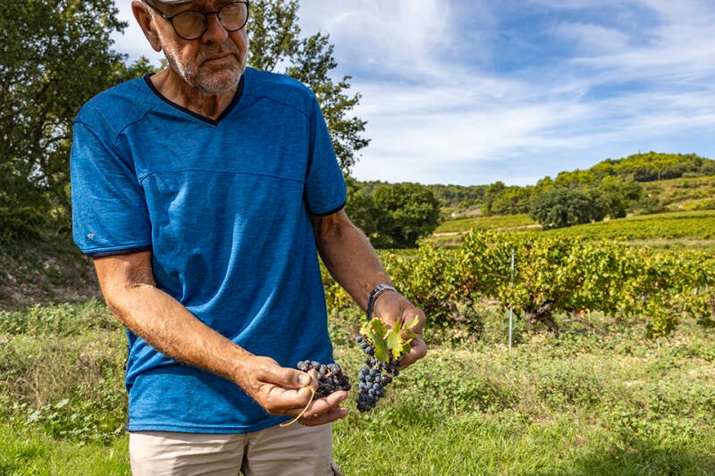 Mensen met grote rieten manden op de rug plukken de druiventrossen die de machine heeft vergeten en op een enkel veld wordt zelfs álles met de hand geplukt.