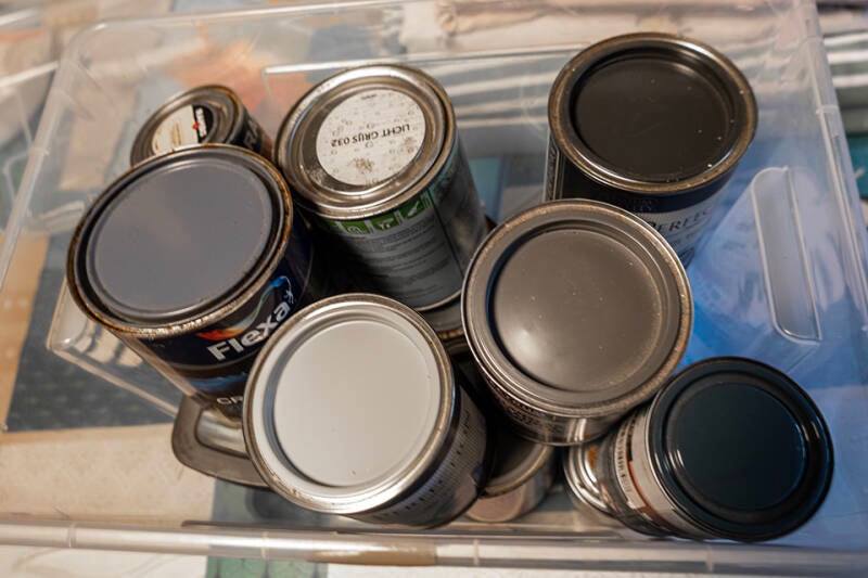Blikken verf komen overal en nergens vandaan en ik herken kleurtjes uit Leeuwarden, Tijnje en Nij Beets en wellicht van nóg eerder... We houden blijkbaar wel van grijs en blauw.... Een paar kleine blikjes wit en blanke lak completeren de bak waarin ik alles bij elkaar verzamel.