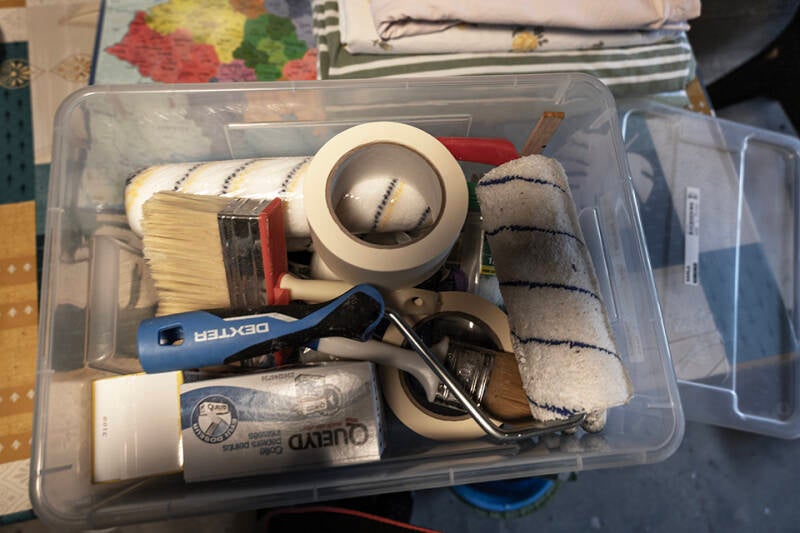 De kwasten en verfrollers in vele maten liggen vanaf nu op één plek en ik verbaas mij erover dat ik deze zaken de afgelopen maanden meermaals heb lopen zoeken en nooit heb gevonden!
