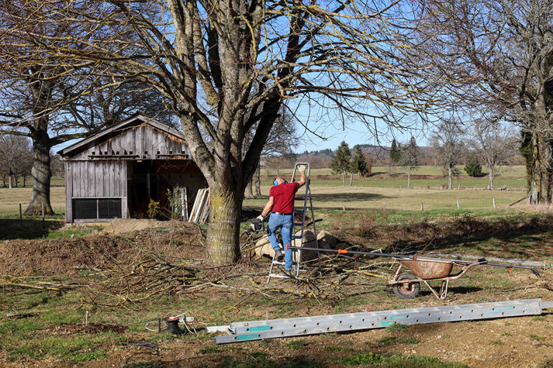 Na een middagje oefenen in boomsnoeien bij vrienden hier in de buurt gaat Jappie los op onze eigen lindeboom in de tuin. Ik sta in eerste instantie met het zweet in mijn handen te kijken naar mijn man die als een soepele jonge vent de boom in klimt en daar aan de slag gaat met kettingzaag en lange takkenschaar. Hij klimt omhoog in onze linde alsof het niks is en ik ga de grote takken die hij laat vallen met een snoeimes in mootjes knippen. Al die kleine stukjes vinden een plekje aan de rand van de tuin waar ruimte genoeg is. Vogels, egels, slangen en andersoortige fauna vinden dat heerlijke plekjes om zich te verstoppen of te gebruiken voor nestjes.