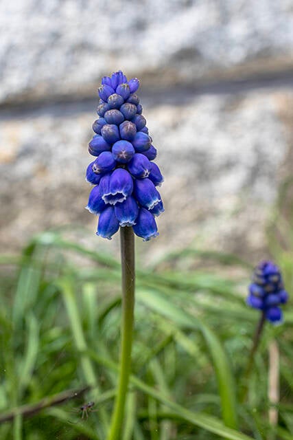 De hagedissen zijn ook in voorjaarsstemming, dat zie je! Een paartje, waarvan het vrouwtje ergens een stukje van haar staartje is kwijtgeraakt, vermaakt zich in het zonnetje op onze muurtjes en in de borders met blauwe druifjes. Het mannetje vindt het niet fijn dat ik in zijn buurt bezig ben met het verplaatsen van blauwe druifjes... hij valt mij min of meer aan! Ik schrik ervan als hij plotseling vlakbij mijn hand een heldhaftige houding aanneemt.... Mijn "wat wil jij nou" maakt plaats voor "ik ga al"...! Ze mogen hun plekje voorlopig lekker houden. Ik vertrek en zoek wel een ander klusje!