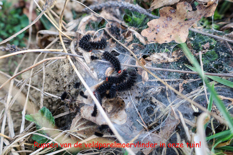 We vinden een heel plakkaat met een soort van web met rupsen. Na te hebben gegoogled blijken het rupsen van de veldparelmoervlinder te zijn! Hier iets meer voorkomend dan in Nederland, maar nog altijd heel bijzonder! We koesteren dit plekje voorlopig dan ook maar even!