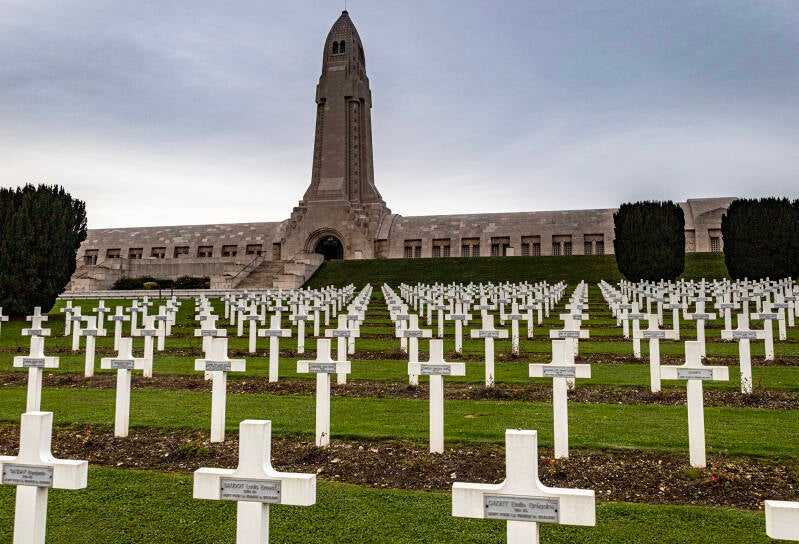 Een pauze bij het Ossuarium van Douaumont bij Verdun geeft een beeld van het zwaarst mogelijk menselijk leed, door oorlogen veroorzaakt. Honderdzestigduizend doden op deze plek geven een indrukwekkend gevoel van eerbied naar de mensen die zich voor hun land en medemens gaven. We lopen om het enorme gebouw heen, met zijn hoge - naar de hemel reikende - toren in het midden en we staan stil bij de begraafplaats waar zeventienduizend witte kruisen stilletjes in een rechte rij staan, herinnerend aan het drama wat hier en elders in de oorlogen heeft plaatsgevonden.