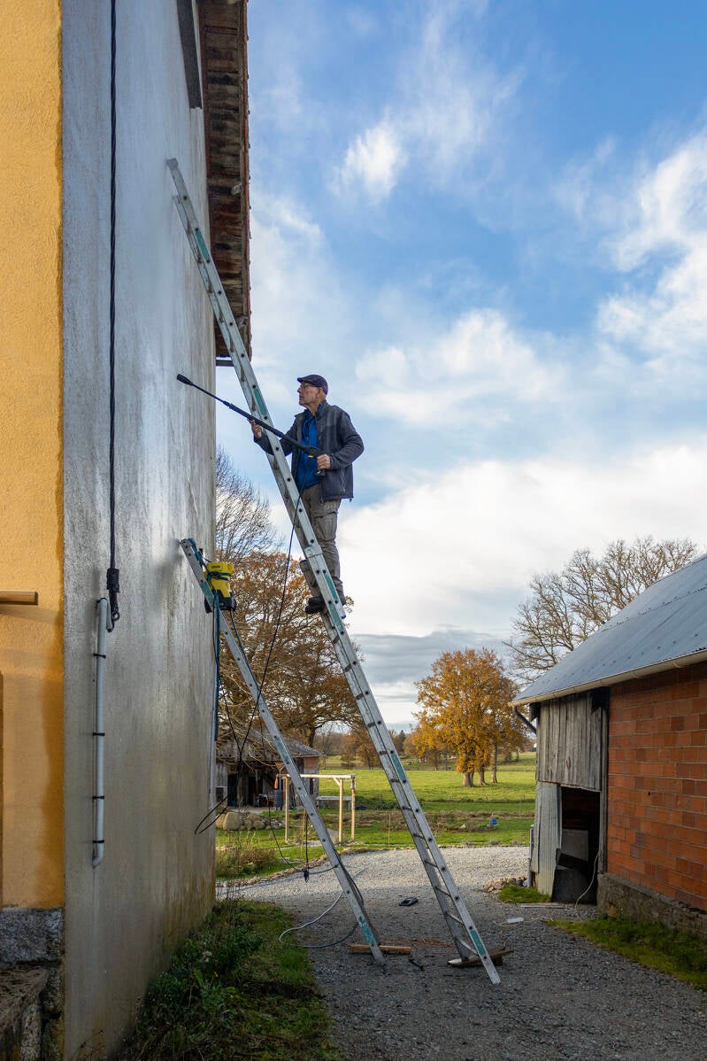 Jappie klimt de ladder op en spuit de buitenmuren met de hogedrukspuit zo schoon mogelijk. Er zijn nog wat afwerkklussen aan de eerder geplaatste nieuwe kozijnen, voordat het balkon geplaatst wordt. Er komt iemand voor het opmeten van het balkon, wat in maart zal worden geplaatst.