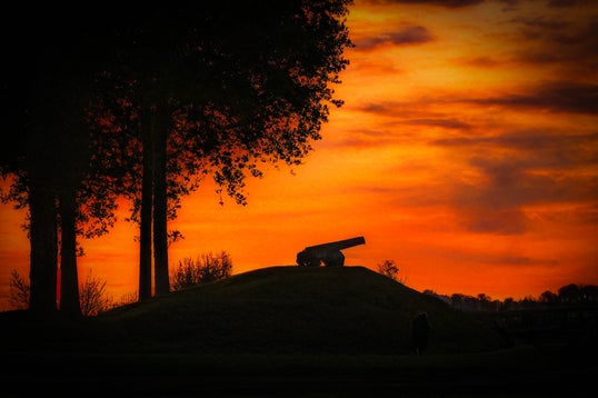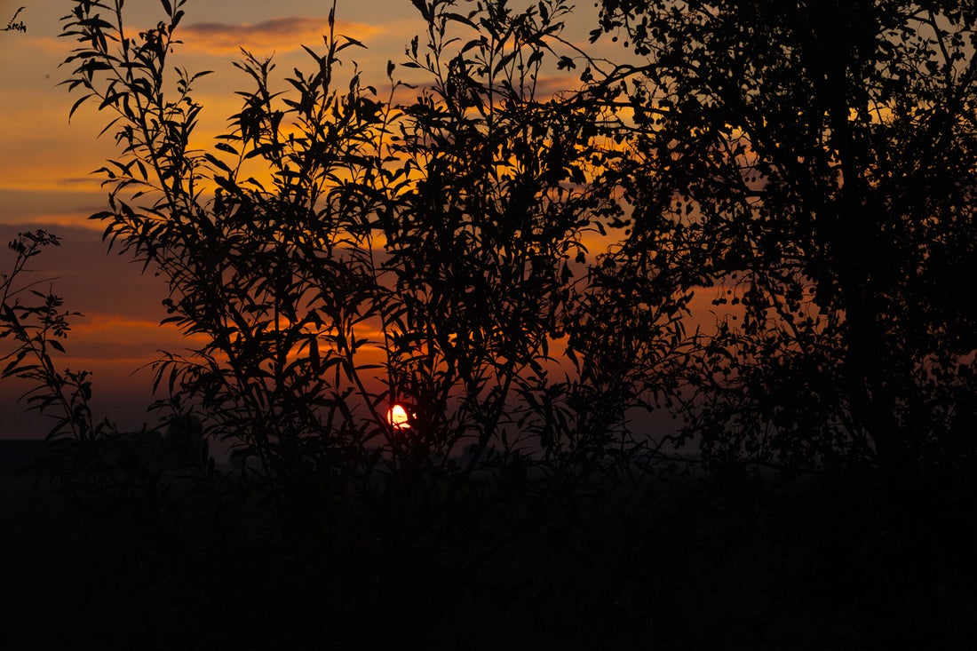 Zon gaat onder, uitzicht vanaf camperplaats tussen de Deelen en Aldeboarn (Fjurlânswei).